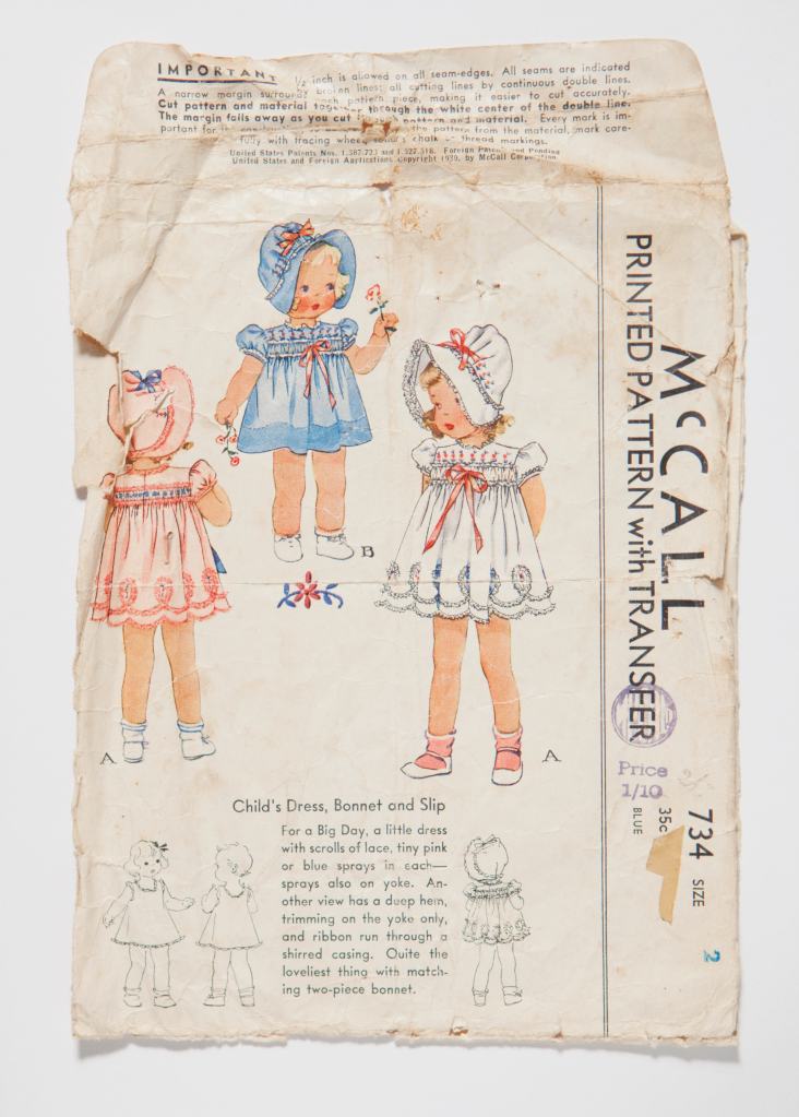 The dress was donated to Te Manawa Museum by Vivienne Burling (formerly Boyce) in 2006. It was accompanied by a photograph of a toddler wearing it and the dressmaking pattern used to make it. Vivienne is the little girl in the photograph. We see her posed in front of a two-tone, match-lined wall. Barely higher than the darkly painted edge of the dado, she stares earnestly at the camera. A large sash bow adorns her hair and her shoes are of soft white leather to match the rest of her outfit. The background suggests the interior of the ubiquitous community hall in which residents gathered for events such as weddings and dances.