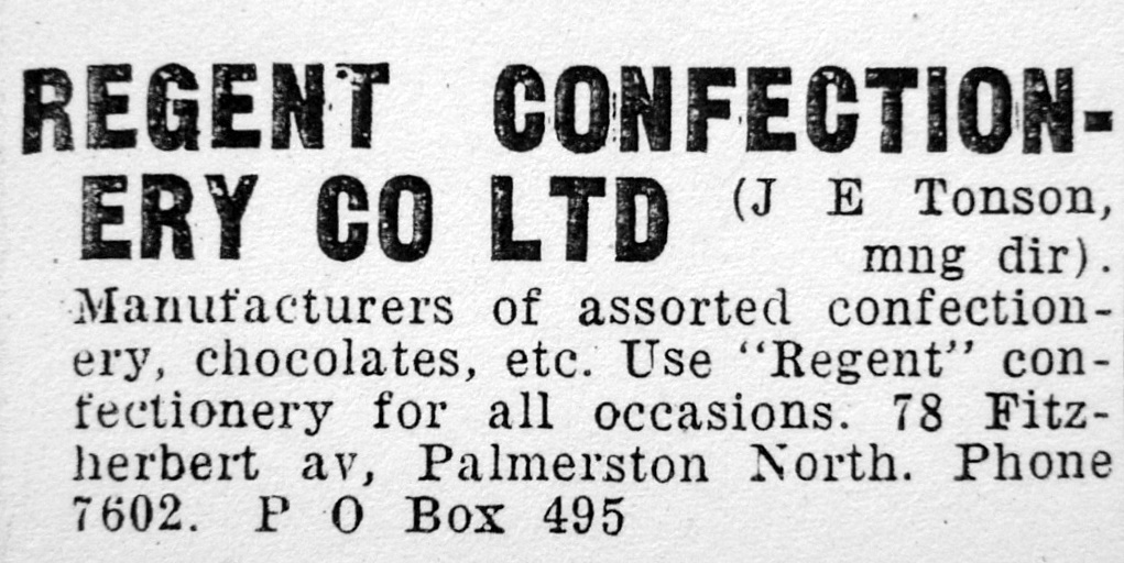 - CO-W 1 Box 61 1052 Regent Confectionery Company, Archives New Zealand, Wellington. ↩︎
