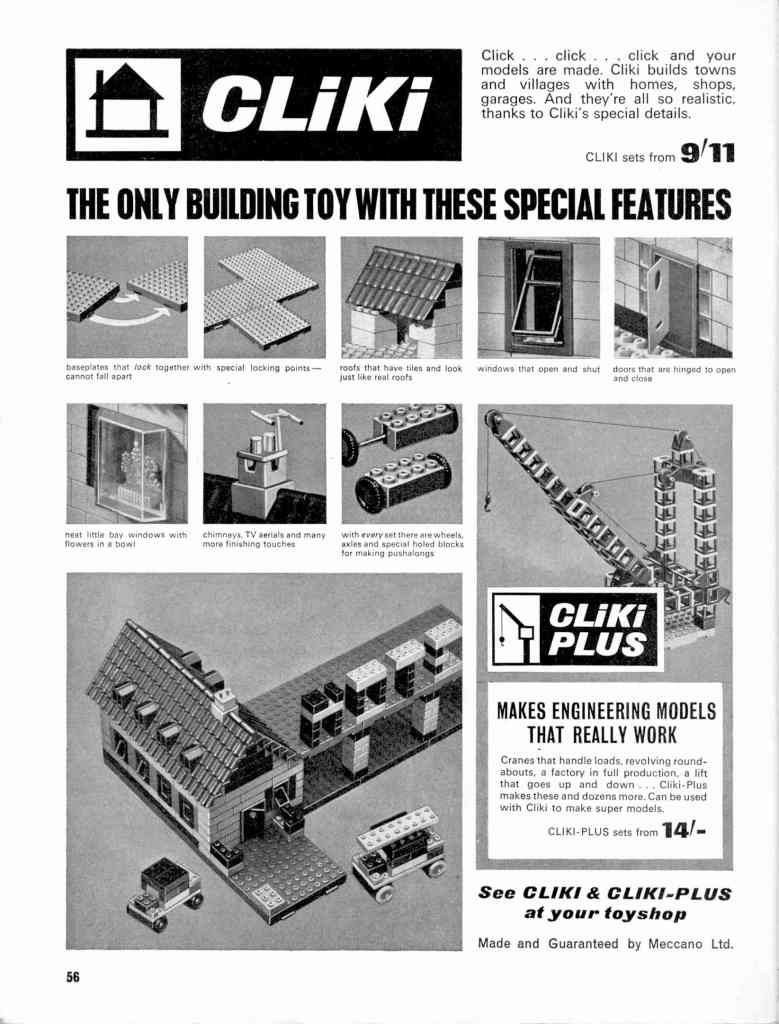 Meccano Ltd introduced ‘Circuit 24’ in 1962 when the directors saw how much money Tri-ang was making from ‘Scalextric’, but the product was a flop. Similarly, the company met the challenge of Lego with an inferior clone branded ‘CLiKi,’ which the Brighton Toy Museum describes as ‘the most disastrous toy in the history of the British toy industry.’4 Other Meccano toys failed to hit the target. There were adjustable roller skates, self-hardening plasticine and the ‘Hornby Hoverer’, a toy hovercraft powered by a glow plug motor. Britain was in the middle of a toy boom when Meccano Ltd went into receivership in 1964. With the boom had come competition and Meccano Ltd failed to show the pioneering verve of its founder.5