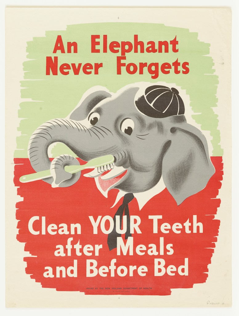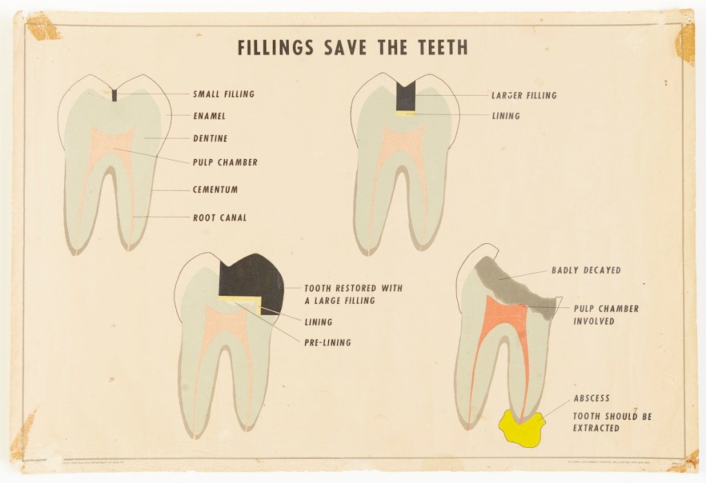 Dental health posters represented this more benign side of the dental experience. Those in Te Manawa range from the colourful and attractive (‘Bombs for Bertie’, the elephant urging children to clean their teeth after every meal and before bed), to others with more technical information about tooth structure and the placement of fillings, presumably directed at adults.