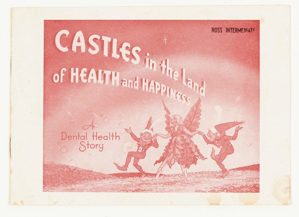 By the 1940s and 1950s the dental nurses had more time to devote to preventive education, and units of health education were formally incorporated into their work day. These included toothbrush drills with children, the use of glove puppets to tell dental stories, health education plays, and lectures to parents and groups. Te Manawa has a story booklet written by dental nurse Lorna Leslie and first published in 1954 by the Department of Health. Titled ‘Castles in the Land of Health and Happiness’, it tells the story of Molly and Peter who go to a magic tooth castle and meet a soldier toothbrush and Princess Good Health. They are told to stay away from sweets and to eat their crusts, as well as plentiful fruit and vegetables. It bears the stamp of Ross Intermediate, and would have been in use there. Dental nurses were encouraged to undertake such creative work, and the Department of Health sometimes held competitions for stories on health-related topics.