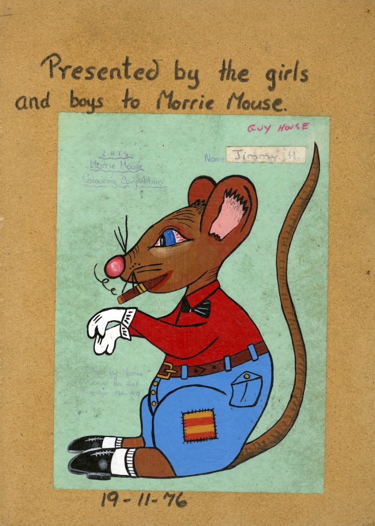 Other items related to Morrie and Monty Mouse have surfaced in the process of doing this research. Apart from photographs, there is a mouse drawing coloured in by a resident of Kimberley Hospital, near Levin, and judged by Morrie during one of his outings beyond the studio.