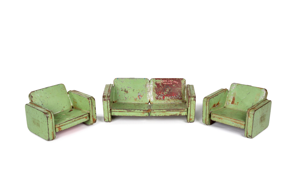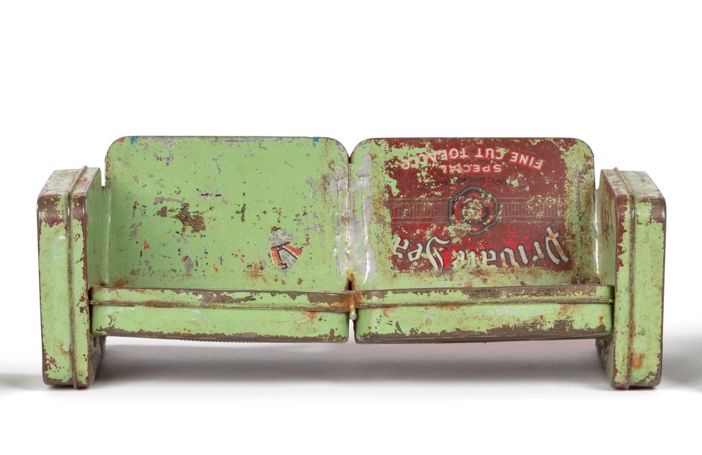 This perfect copy of a 1930s lounge suite with its slab sides and squared corners was made from tobacco tins in the 1930s or 1940s. The printed design showing through the paint helps to date the tins to this period. ‘Stewart’s Private Seal Special Fine Cut Tobacco’ and ‘Player’s Airman Virginia Cigarette Tobacco’ were popular brands.