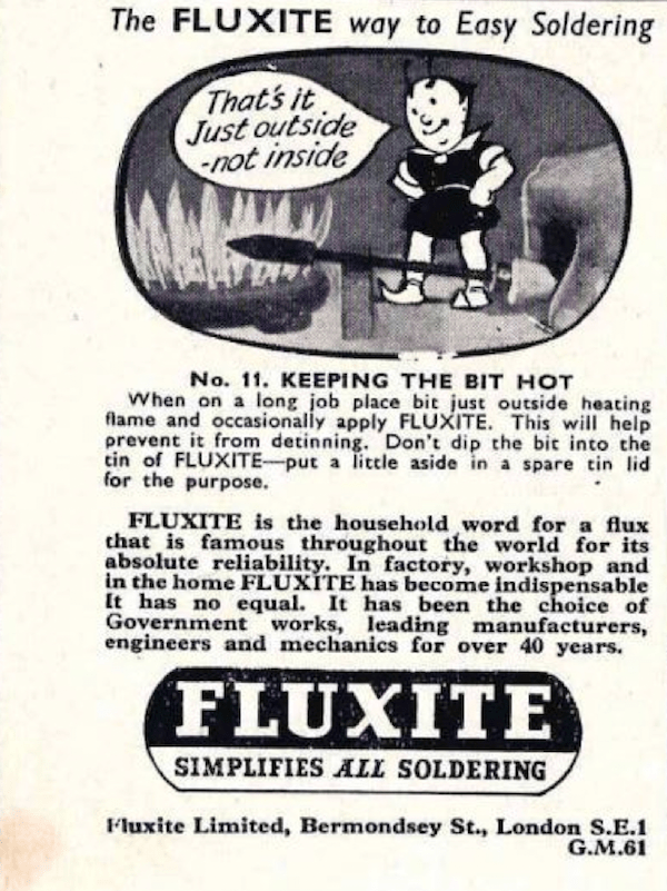 Since many home appliances and toys were made from tin or mild steel, an ability to work with soft solder was seen as a useful and manly skill. Boys’ magazines such as the Meccano Magazine carried advertisements and articles on how to solder, and today’s collector of artefacts from tin toys to alarm clocks will often find items which have been repaired with solder.