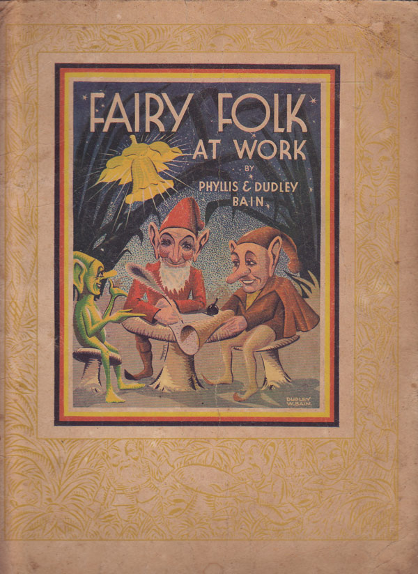 More imaginatively, and less educationally, Bain collaborated with his wife Phyllis Bain (née Bostock) in a children’s book ‘Fairy Folk at Work’. Phyllis wrote the story, which tells how one night each year the gnomes, elves, water spirits and fairies gather to plan the summer. Each of the twelve pages of text faces a full-page colour illustration by Dudley Bain. Additionally, each page has a pictorial border of gnomes and sprites.