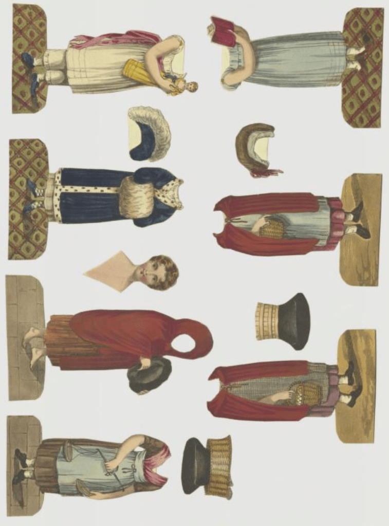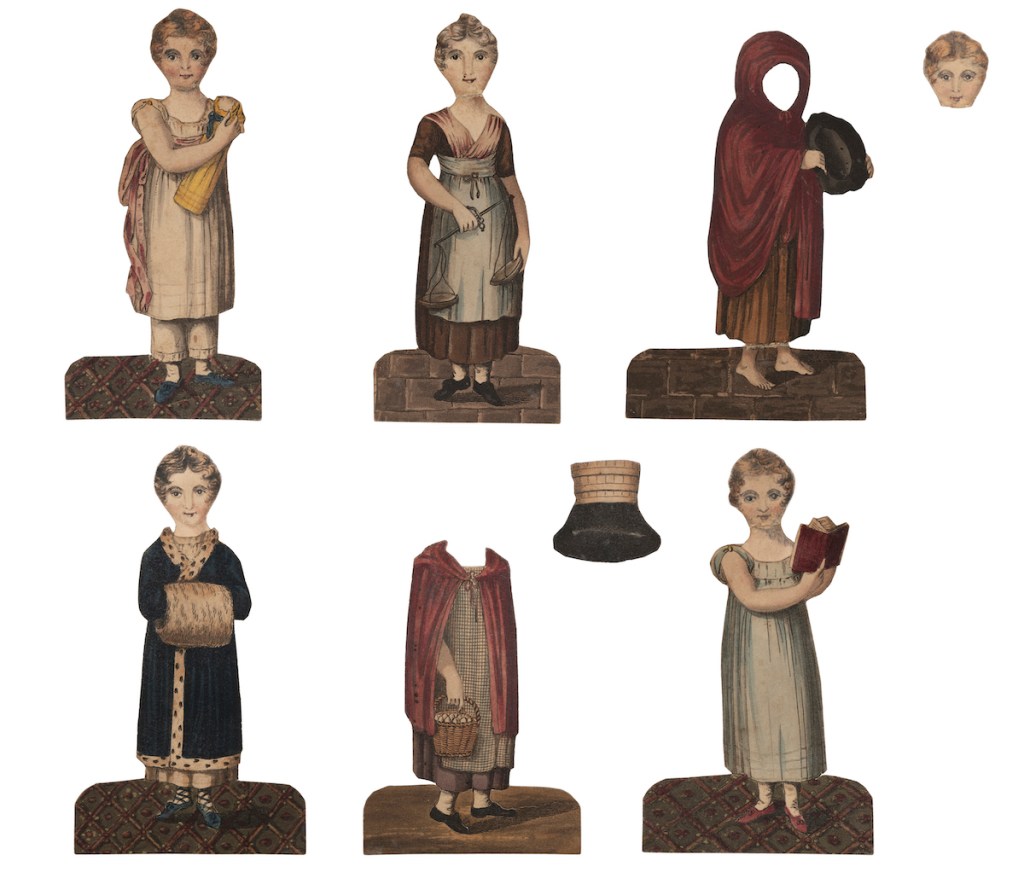 Modern commercial paper dolls aimed at a children’s market had their real precursor in ‘toy books’. ‘Little Fanny’ was the first paper doll character that was developed specially for children. The History of Little Fanny, Exemplified in a Series of Figures, was published by S. & J. Fuller, London, in 1810. It consisted of a slipcase with a storybook, seven cutout figures, a head that could be moved from one outfit to the next, two hats, a basket of fish and a barrel of milk. These items were used to act out a tale that was meant to warn girls of the dangers of immorality and the benefits of virtue.11