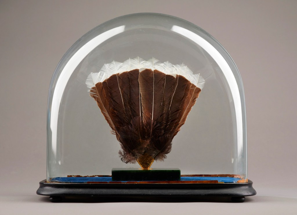 This rare remu marereko (fan of tail feathers) of the extinct huia (Heteralocha acutirostris) was on safe deposit at Te Manawa by arrangement with its guardian for over a decade; it has been returned to private ownership.