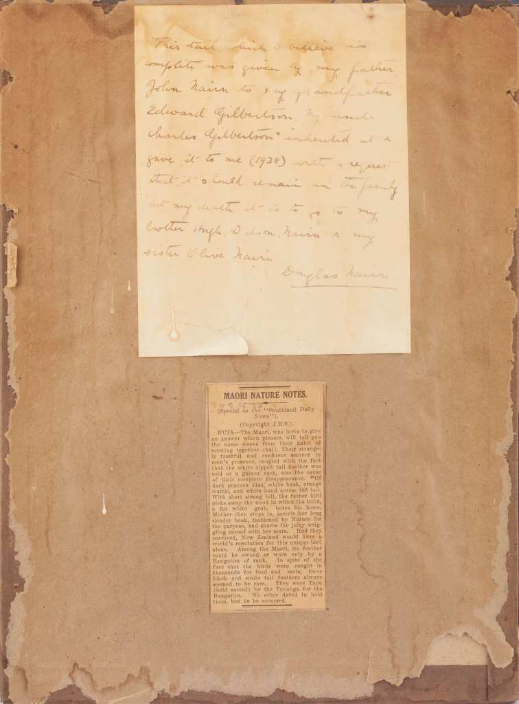 On the back of the original framed image, a note signed ‘Douglas Nairn’ adheres to the backing board above a small newspaper clipping, entitled ‘Maori Nature Notes’. The article, marked ‘special to the Southland Daily News’, suggests that Māori named huia for the birds’ habit of meeting (hui) and their trustful manner in human company. It observes that the valuation of feathers at a guinea each (approximately $200 today) would have contributed to the bird’s decline, and states that huia feathers were tapu (sacred) and worn only by rangatira.10